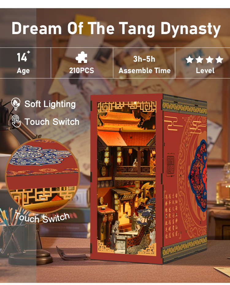 This kit comes with a touch-sensitive switch, allowing you to easily turn on/off the lighting with a simple tap. No need to fumble with switches or plugs—just a light touch to activate the beautiful glow of your DIY Book Nook kit 3D wooden puzzle.