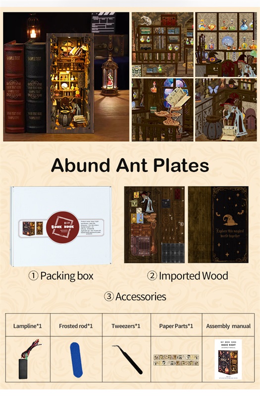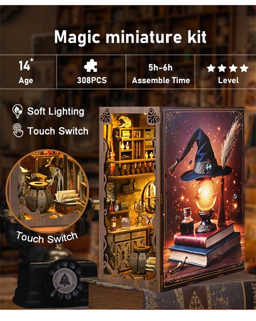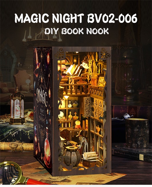 The Magic Book Nook DIY Kit is a captivating fusion of creativity, craftsmanship, and storytelling. Designed for enthusiasts who love literature and hands-on projects, this DIY miniature house kit transforms your bookshelf into a portal to an enchanting world. With 308PCS of high-quality pre-cut wooden pieces, stickers, and a pre-assembled electronic kit, this DIY project offers an immersive building experience and a charming decorative piece for your home.