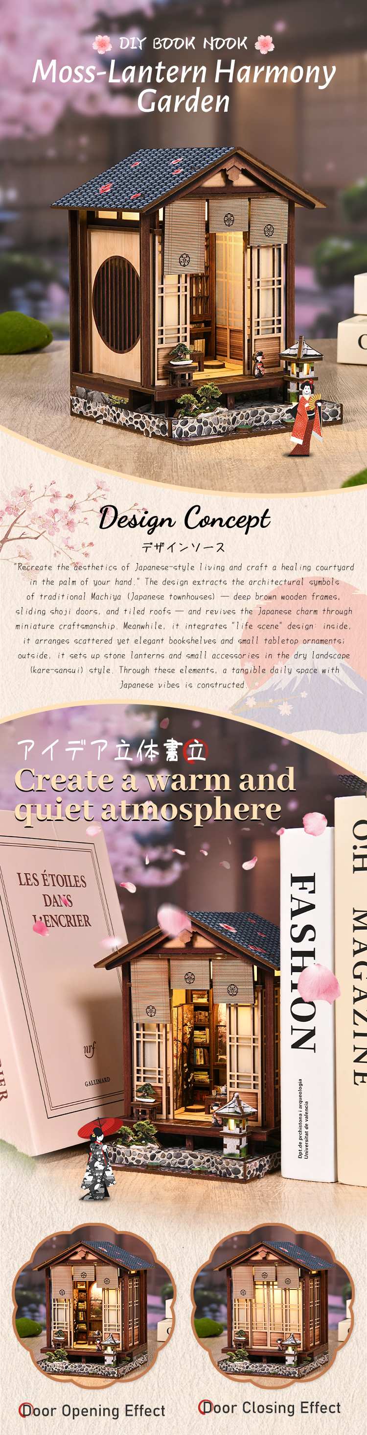 Recreate the aesthetics of Japanese-style living and craft a healing courtyard in the palm of your hand with the Moss Lamp and Garden DIY Mini House. This miniature DIY kit draws inspiration from traditional Machiya townhouses, featuring deep brown wooden frames, sliding shoji doors, and tiled roofs. Inside, the layout includes elegant bookshelves, screen tea tables, and small tabletop ornaments. Outside, a dry landscape (kare-sansui) style is created with stone lanterns, miniature pathways, and falling cherry blossom decorations.