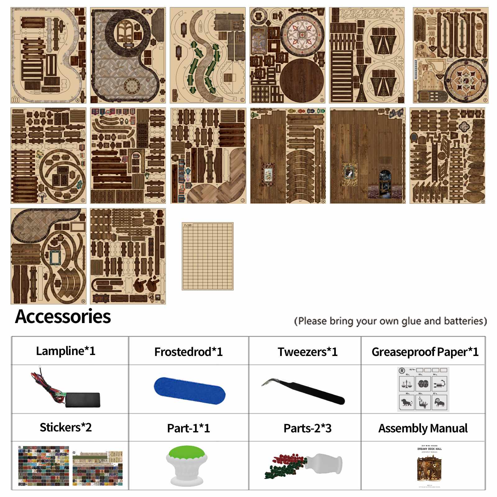 Comes with 411 pcs of components, lampline, frosted rod, tweezers, paper sheets, greaseproof paper, and a step-by-step manual—everything needed to build your diy miniature house masterpiece.