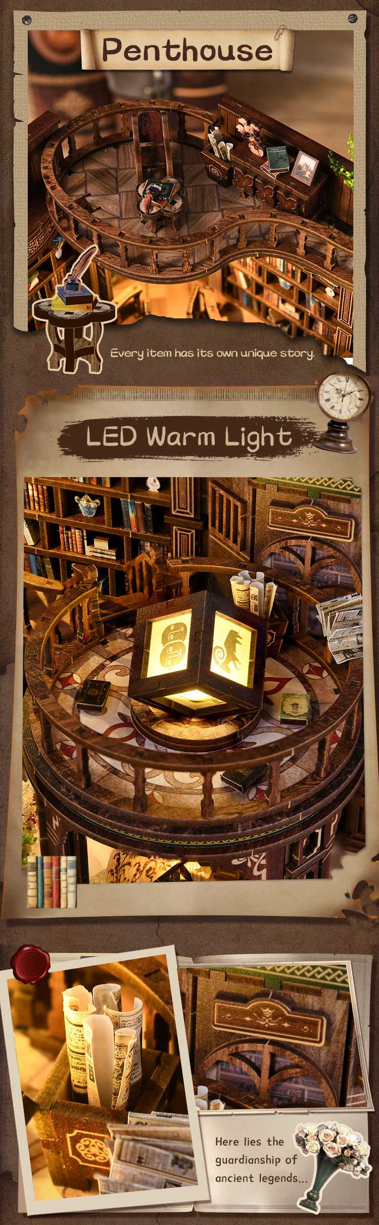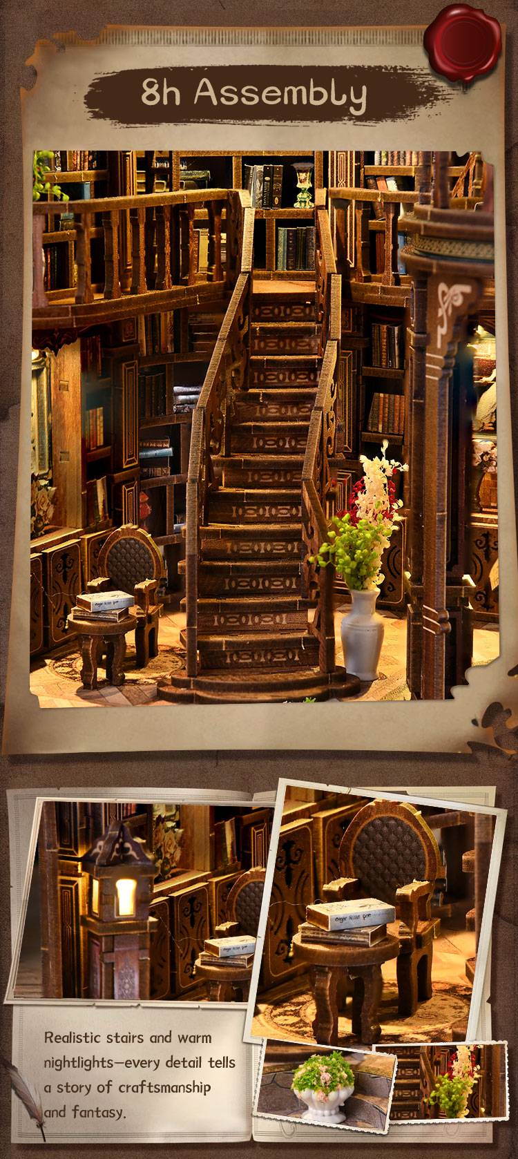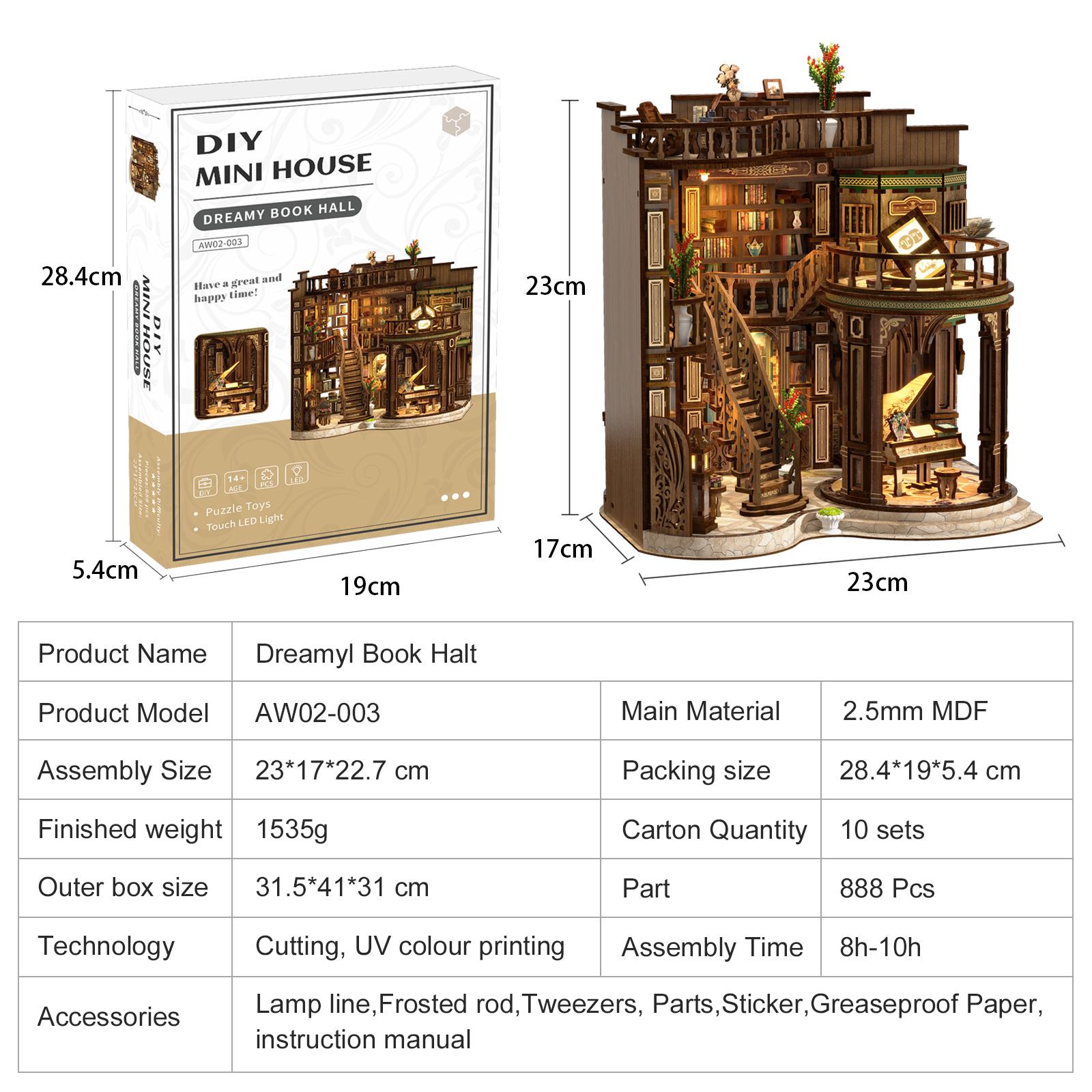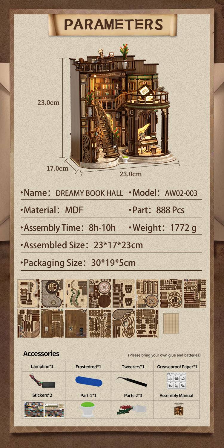Every detail— from the realistic staircase to the warm nightlight— recreates the charm of a cozy reading corner. The Dreamy Bookhall is more than a miniature mansion; it is a palace of knowledge and wonder waiting to be explored. With 888 precision-cut MDF parts, this miniature house kit offers a hands-on crafting journey that rewards patience, focus, and artistic expression.