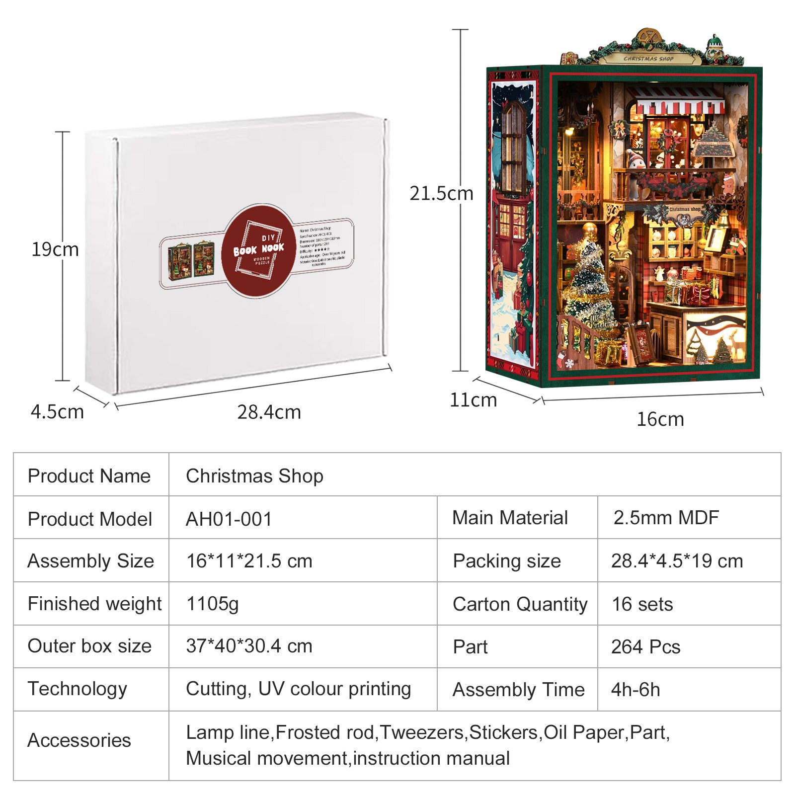 Soft yellow LED lights illuminate the shop window, instantly enhancing the cozy Christmas atmosphere and making your Diy Book Nook Kit glow beautifully at night.