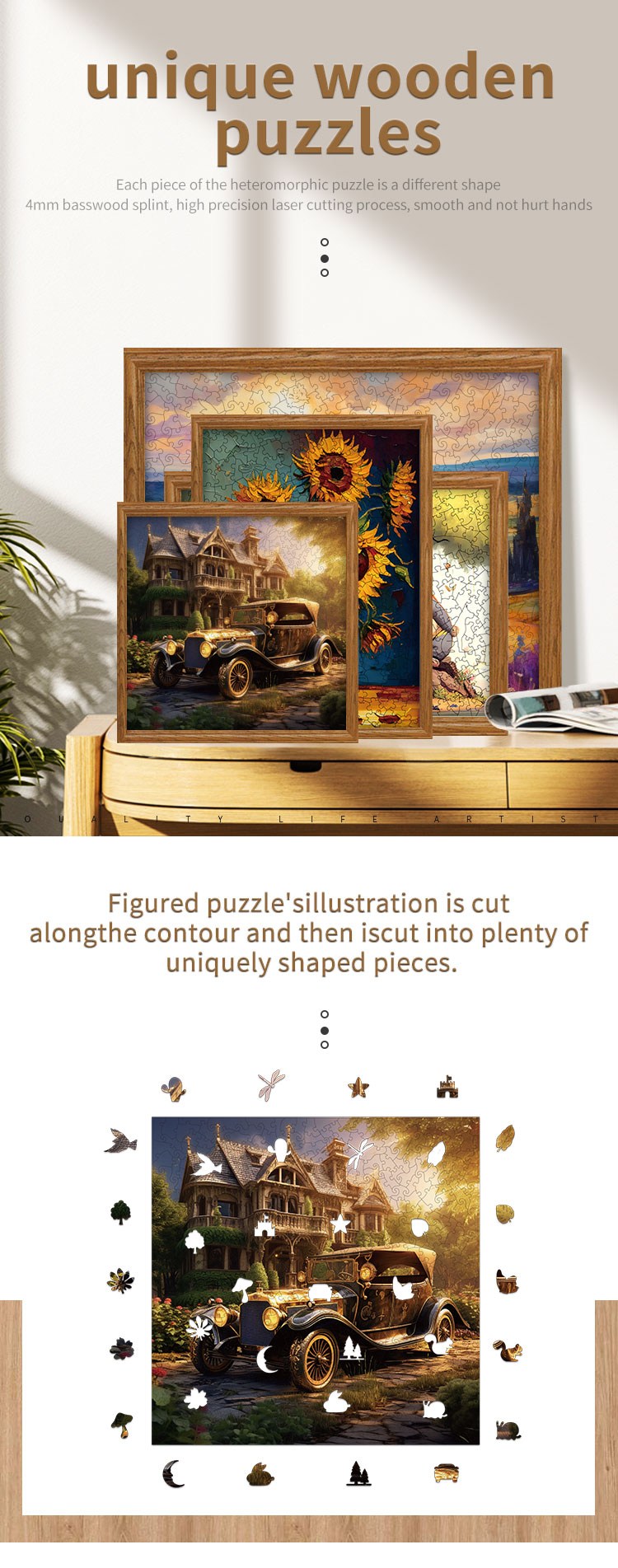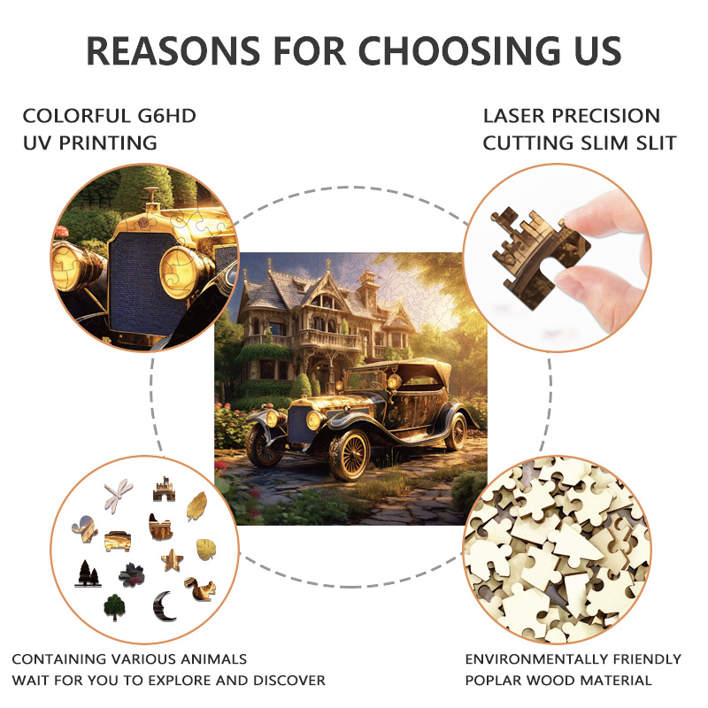 The 3D Castle Puzzle is a beautifully designed 3D puzzle castle that brings a touch of vintage charm into your home. This castle jigsaw puzzle features intricate details, including a classic castle scene with a vintage car, giving it a unique and realistic appearance. Made from high-quality 4mm poplar plywood, each piece is precision-cut with a laser cutting process to ensure smooth edges that are safe for hands.