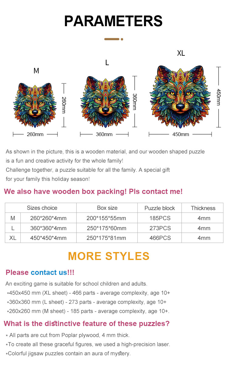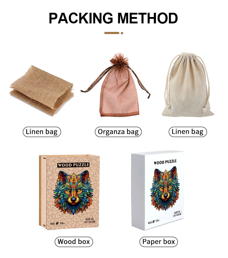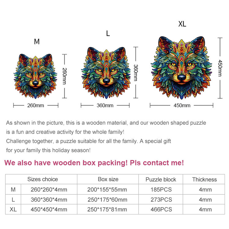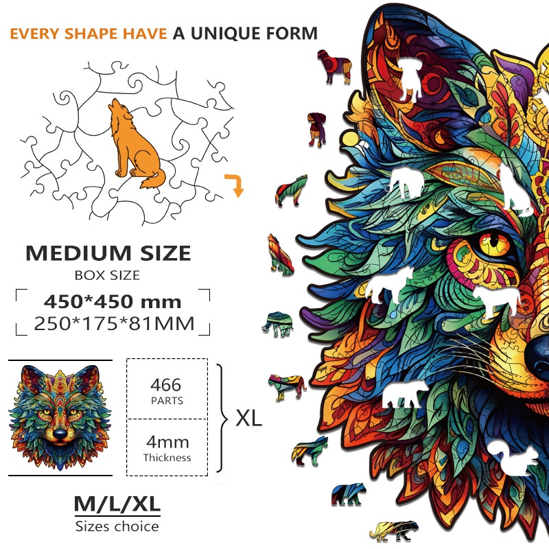 The 3D Wolf Puzzle is a stunning 3D puzzle animal that combines creativity, fun, and challenge for the whole family. Made from high-quality 4mm poplar plywood, each piece is precision-cut with a laser cutting process to ensure smooth edges that are safe for hands. Unlike regular puzzles, each piece of the heteromorphic puzzle has a unique shape, creating a visually striking 3D wolf head when fully assembled.