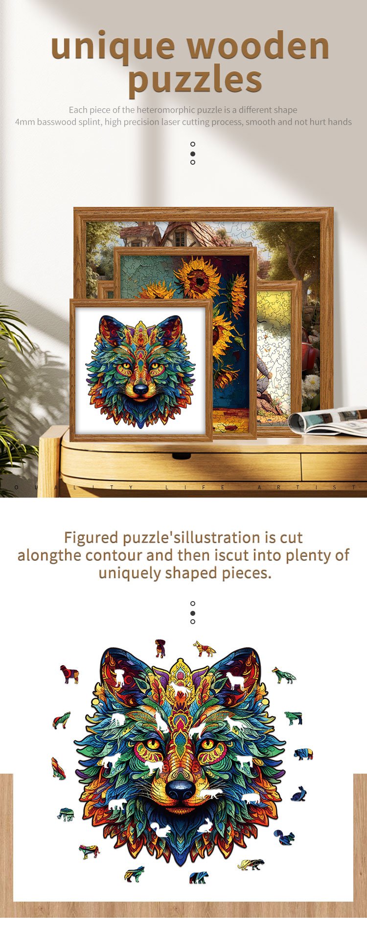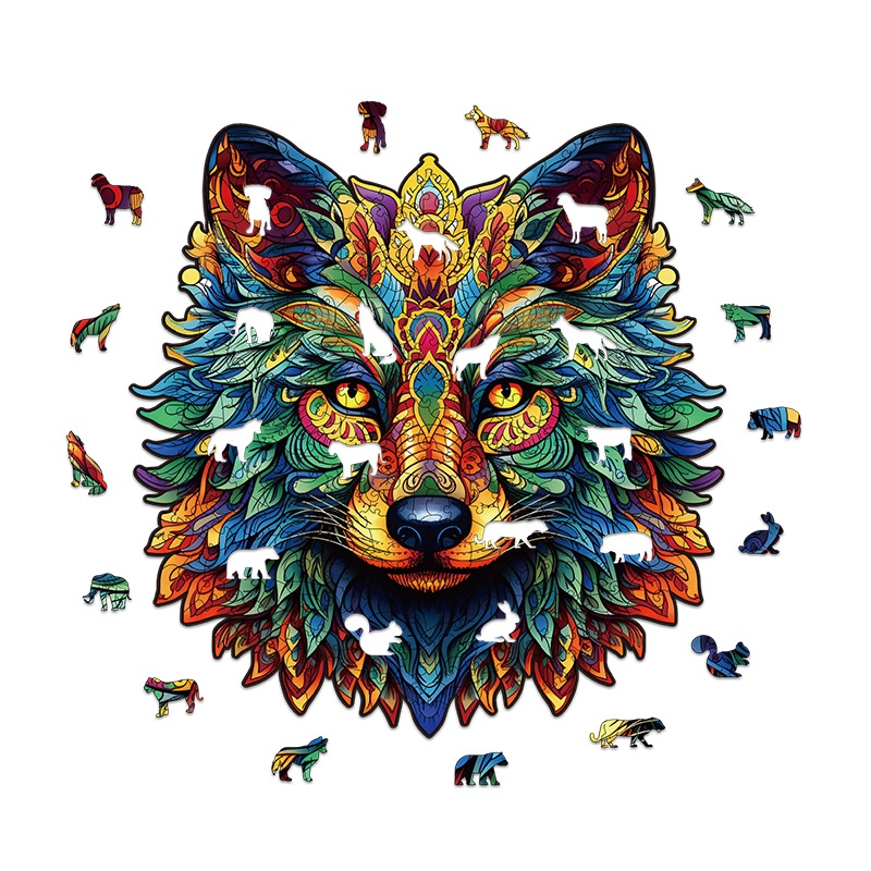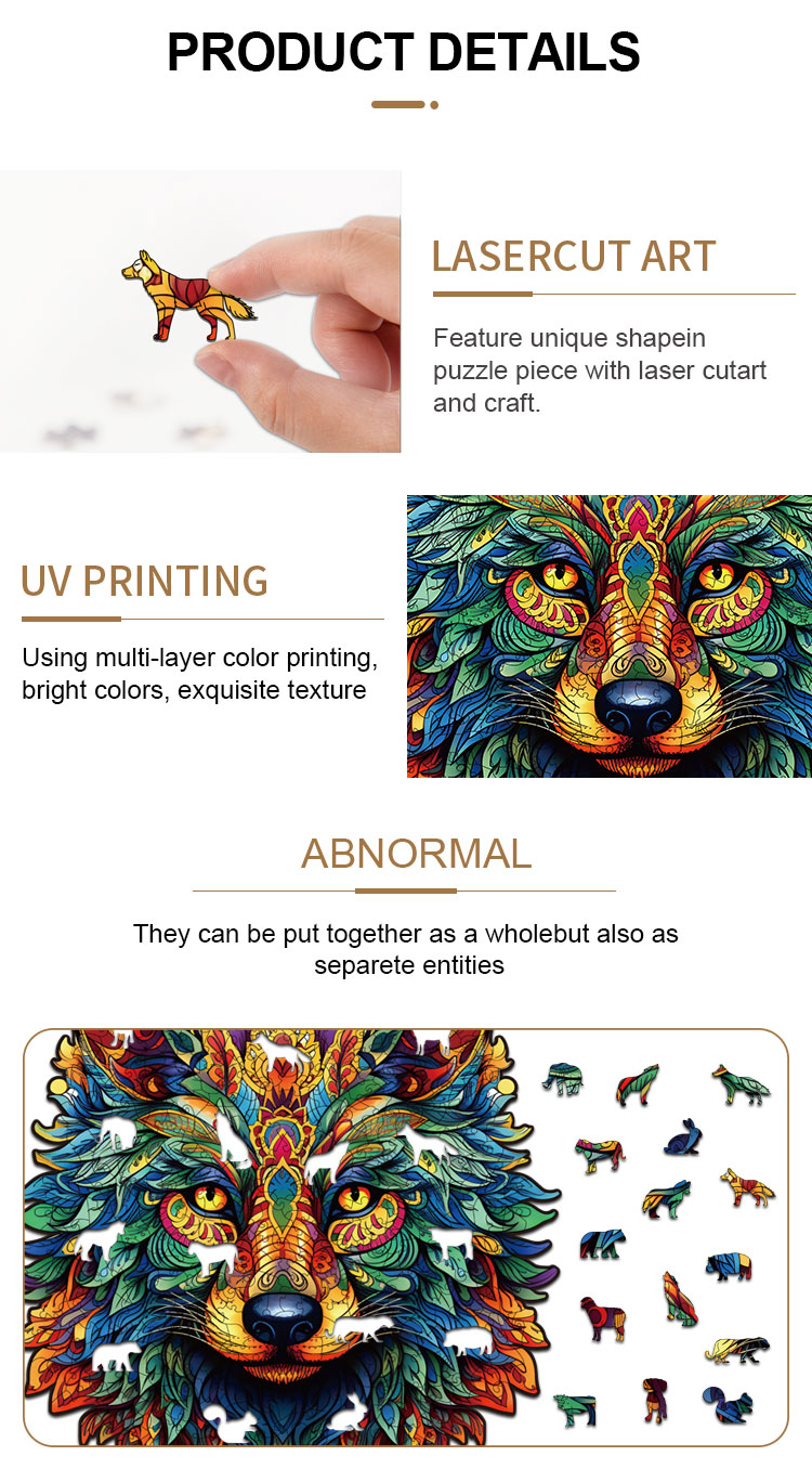 A1: Each piece is laser-cut into a unique shape, and the pieces can form separate animal figures or combine to create a stunning wolf head.